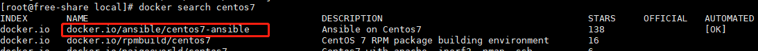 1 2 3 4 5 6 7 8 9 10 11 12 13 14 15 | [root@free-share local]# docker pull docker.io/ansible/centos7-ansibleUsing default tag: latestTrying to pull repository docker.io/ansible/centos7-ansible ...latest: Pulling from docker.io/ansible/centos7-ansible45a2e645736c: Pull complete1c3acf573616: Pull completeedcb61e55ccc: Pull completecbae31bad30a: Pull completeaacbdb1e2a62: Pull completefdeea4fb835c: Pull completeDigest: sha256:39eff7d56b96530d014083cd343f7314c23acbd1ecf37eb75a71a2f6584d0b02Status: Downloaded newer image for docker.io/ansible/centos7-ansible:latest[root@free-share local]# docker imagesREPOSITORY TAG IMAGE ID CREATED SIZEdocker.io/ansible/centos7-ansible latest 688353a31fde 5 years ago 447 MB |